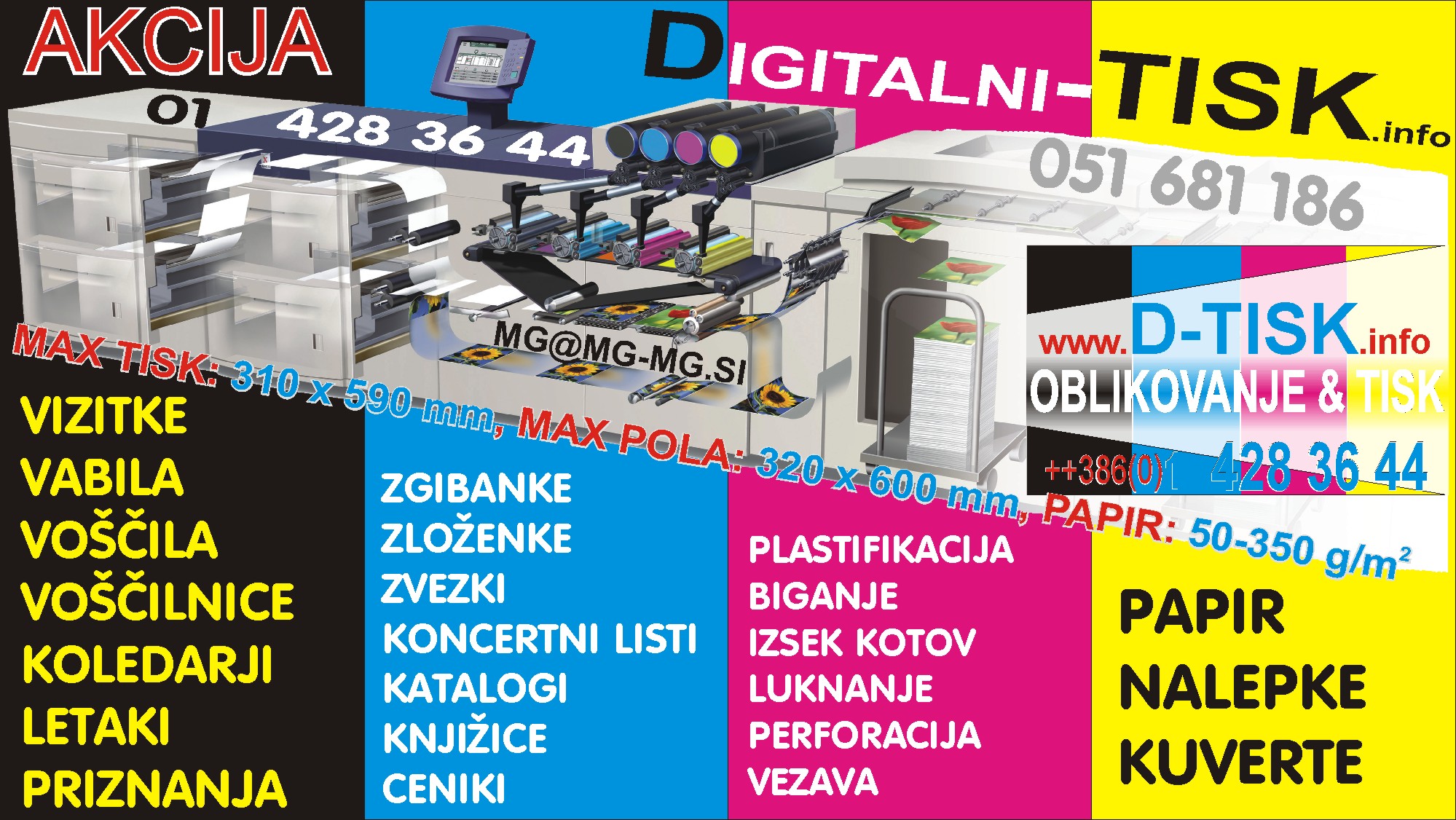 gostovanje omogoča Webicom za manj kot 0,52 EUR / mesec gsm: 051 681 186 Pokličite nas: 01 428 36 44 PIŠITE NAM D-TISK.info POPUSTI in AKCIJE O nas Papir, kuverte, nalepke ... Razrez, plastifikacija, vezava, ... Zgibanke, zloženke, bilteni, zvezki ... Vizitke, letaki, priznanja ...